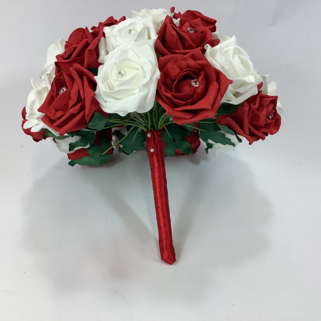 Superbe bouquet de roses artificielles fait main avec des strass au centre des roses. Diamètre du bouquet 25 cm, hauteur 27 cm. Possibilité de l'avoir dans 35 couleurs, ou uni. Présenté en rouge rubis et blanc avec un ruban assorti. Il mesure 25 x 27 cm. Optez pour la rose artificielle éternelle.