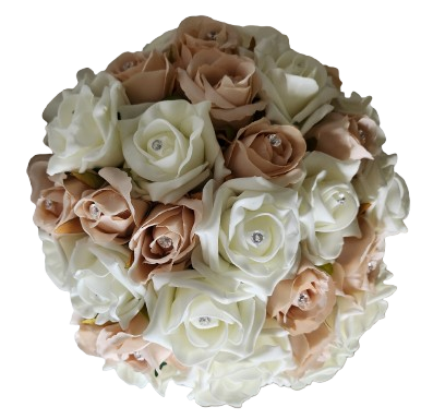 Les bouquets de demoiselle d’honneur sont également disponibles dans ce design sur demande! Le bouquet est présenté avec des rose blanches en mousse et des roses en soie beige.