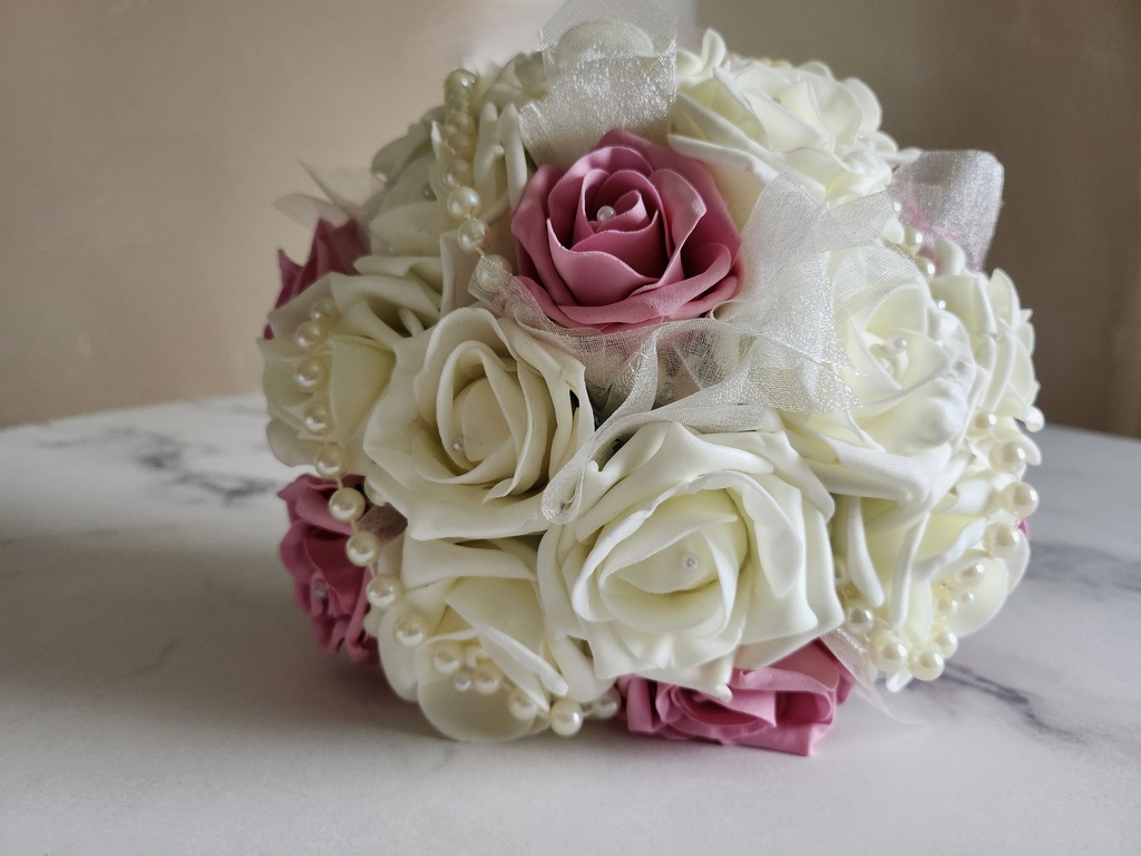 Bouquet artificiel de roses en mousses avec des colliers de perles.