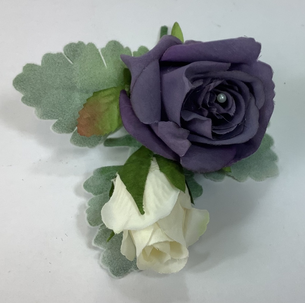 Boutonnière en soie composée d'une rose ouverte, d'un bouton de rose et de feuilles poussiéreuses. Disponible dans 11 coloris.